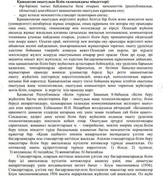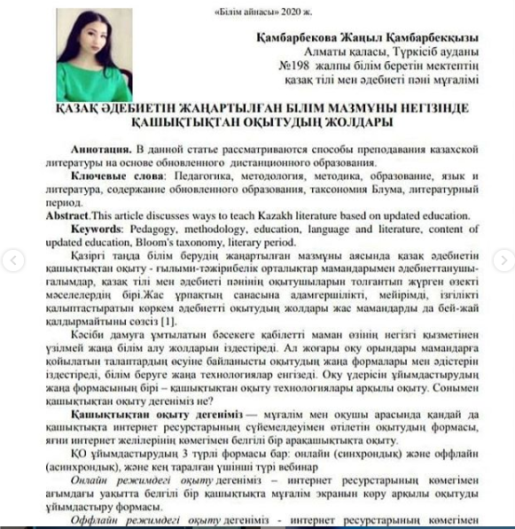 " Қазақ әдебиетін жаңартылған білім мазмұны негізінде қашықтықтан оқытудың жолдары " атты мақаланың авторы қазақ тілі мен әдебиеті пәні мұғалімі: Қамбарбекова Жаңыл Қамбарбекқызы