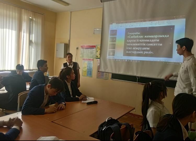 Оқушыларға сыбайлас жемқорлық, еліміздің әлеуметтік - экономикалық даму үдерісін, нарықтың экономикалық құрылуын, инвестициялар тарту процесін тежейтіндігі жан - жақты түсіндірілді.