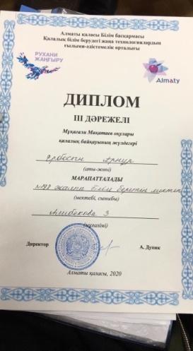 13 ноябрь 2020 0 1 2 3 4 5 Мұқағали Мақатаев оқуларының қалалық байқауының ІІІ дәрежелі диплом иегері 1 сынып оқушысы Ербосын Арнұр , жетекшісі:З.Алибекова