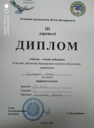 19 ноябрь 2020 0 1 2 3 4 5 «Айтыс-сөздің майданы» атты жас айтыскер ақындардың қалалық айтысының жеңімазы Нурмолдаев Данияр,жетекшсі: А.Ш.Аймаханова