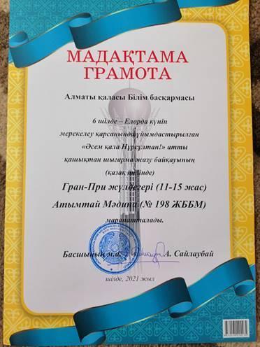 11 март 2021 0 1 2 3 4 5 Алматы қаласы, Білім басқармасы 6-шілде Елорда күнін мерекелеу қарсаңында ұйымдастырылған «Әсем қала – Нұрсұлтан!» атты қшықтан шығарма жазу байқауының Гран-При жүлдегері Атымтай Мәдина