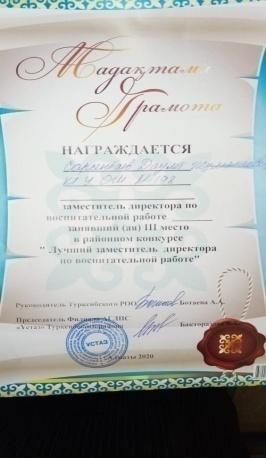 14 апрель 2021 0 1 2 3 4 5 Аудандық «Үздік директордың тәрбие ісі жөніндегі орынбасарлары» атты байқаудың жүлдегері, эссе байқауының ІІІ орын жүлдегері Сарсенбаев Даулет Жуматаевич