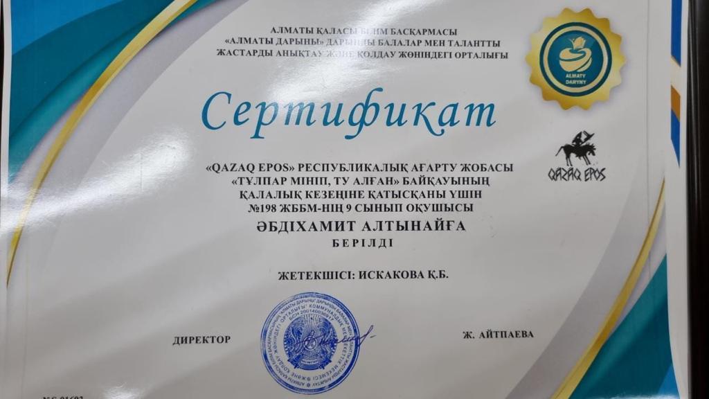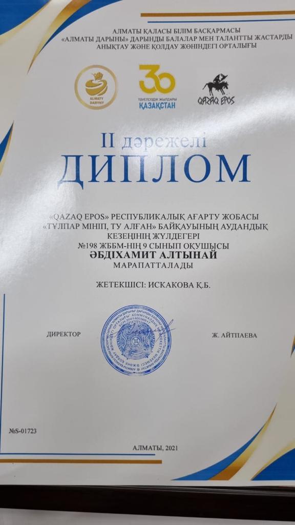 12 ноябрь 2021 0 1 2 3 4 5 Оқушы жетістіктері; "Тұлпар мініп, ту алған" байқауының аудандық, қалалық кезеңінің жулдегері 9 сынып оқушысы Әбдіхамит Алтынай.