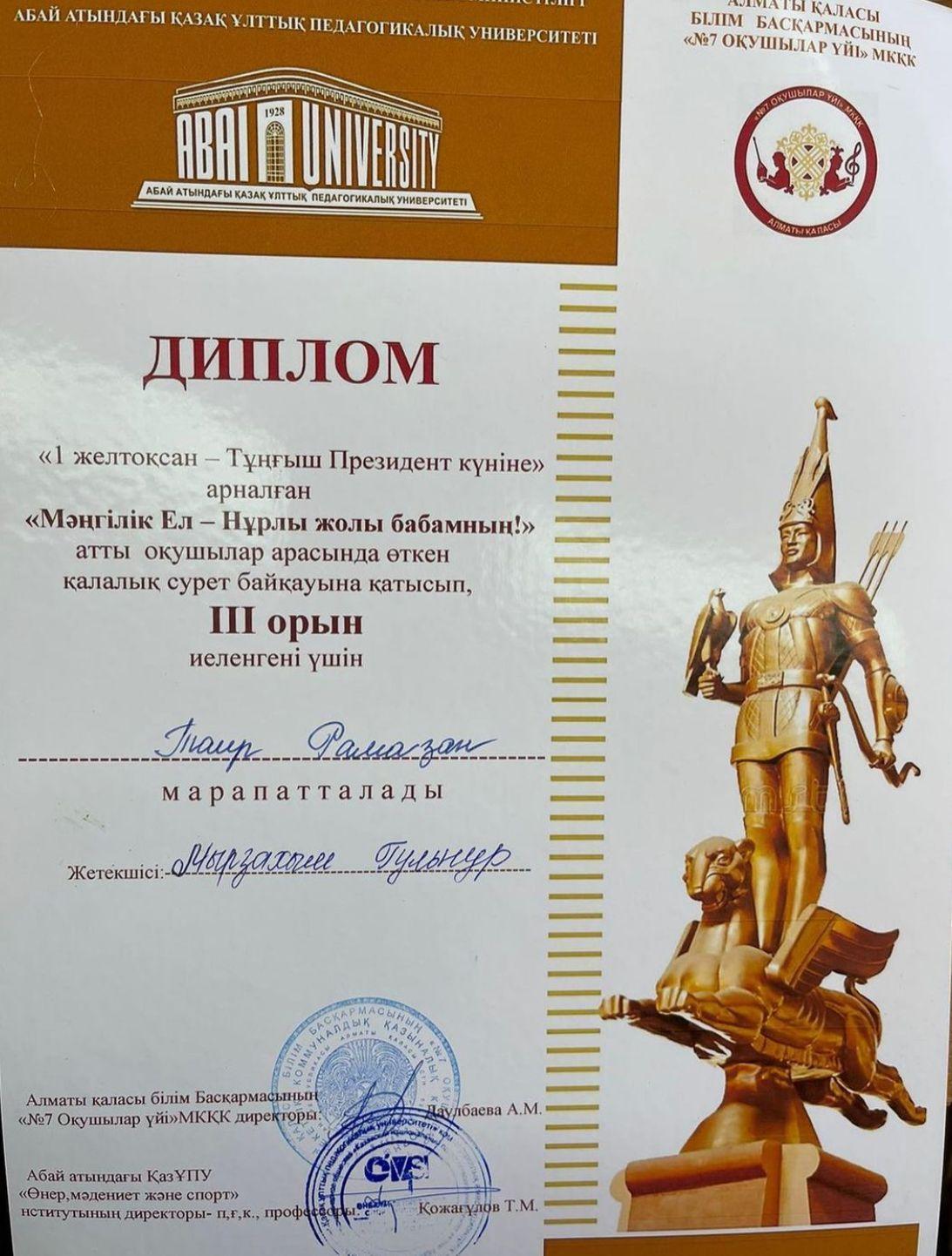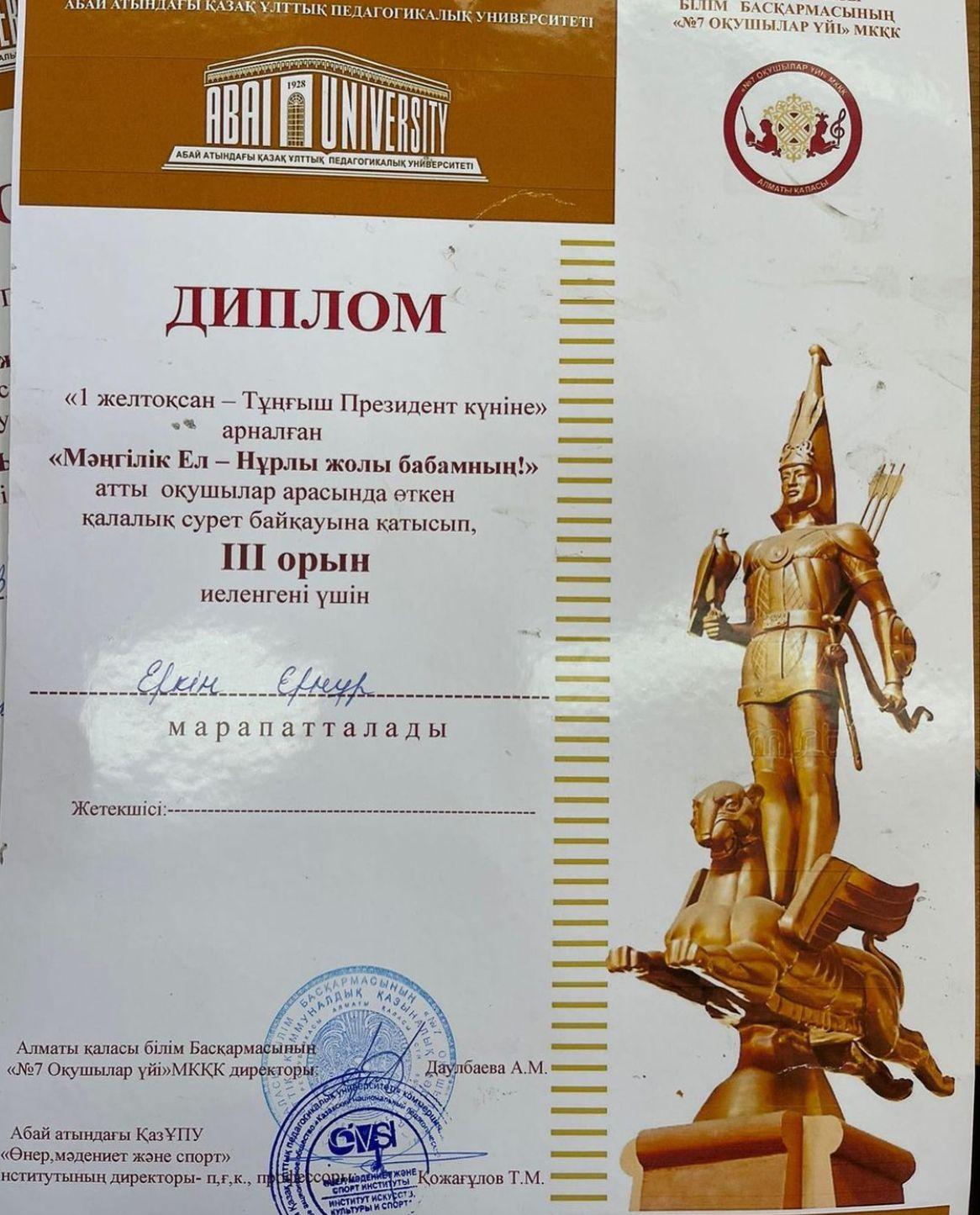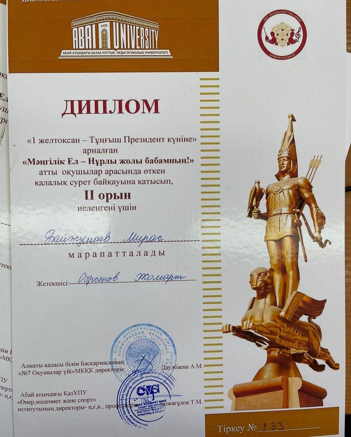06 декабрь 2021 0 1 2 3 4 5 "1 желтоқсан-Тұңғыш Президент күніне " арналған "Мәңгілік Ел-Нұрлы жолы бабамның" атты оқушылар арасында өткен қалалық сурет байқауының жеңімпаздары.