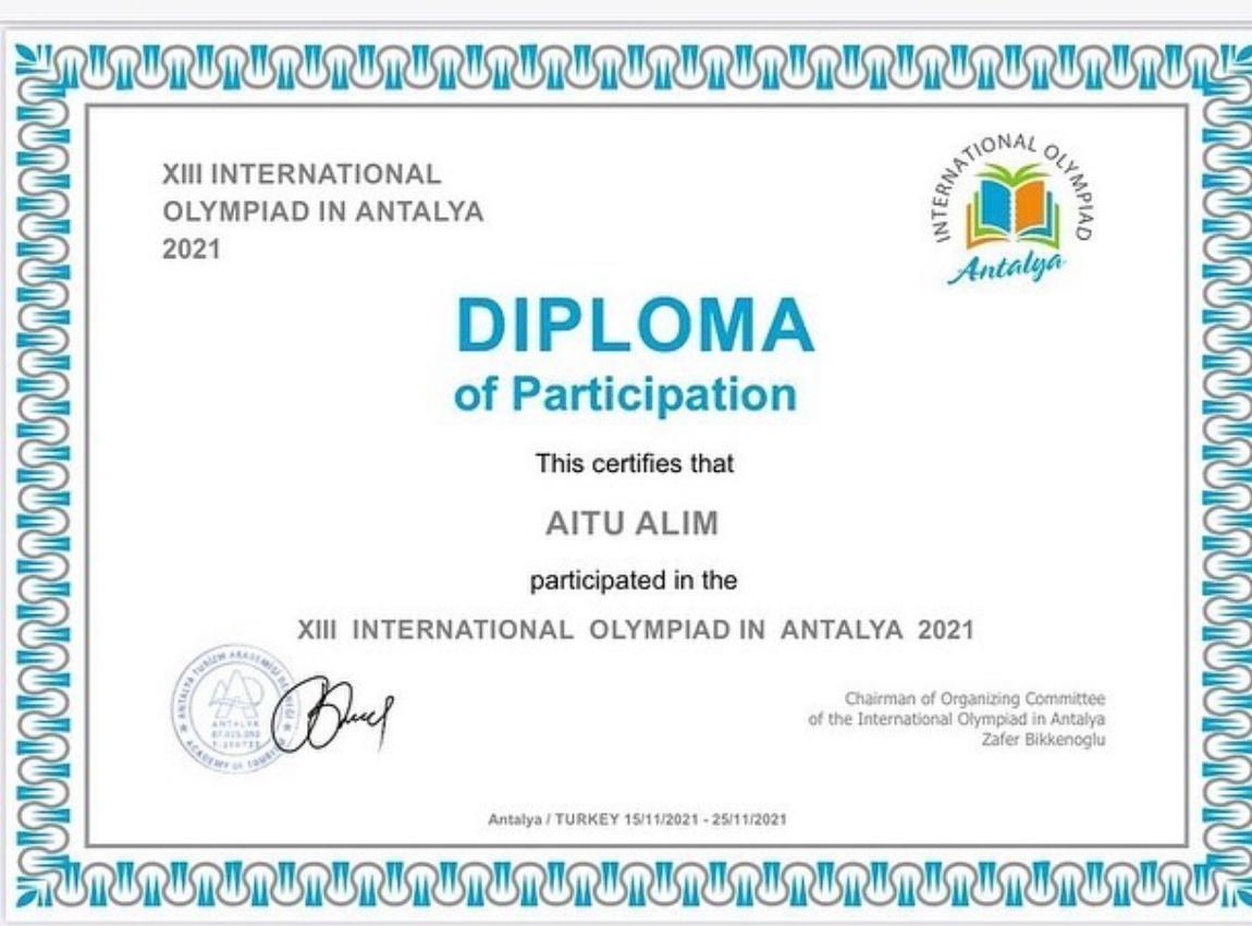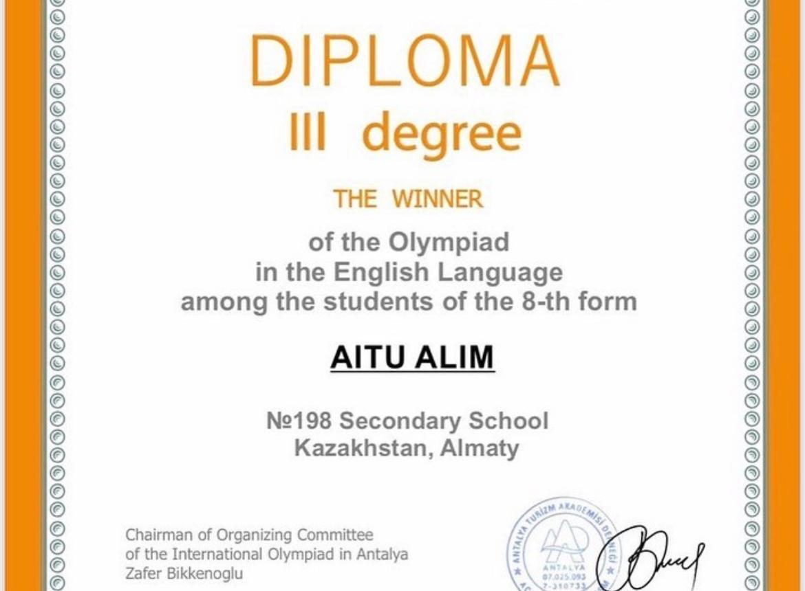 13 декабрь 2021 0 1 2 3 4 5 Оқушы жетістіктері: Мектебіміздің 8 сынып оқушысы Айту Алим ағылшын тілі пәнінен халықаралық олимпиададан 3 дәрежелі дипломмен марапатталды.