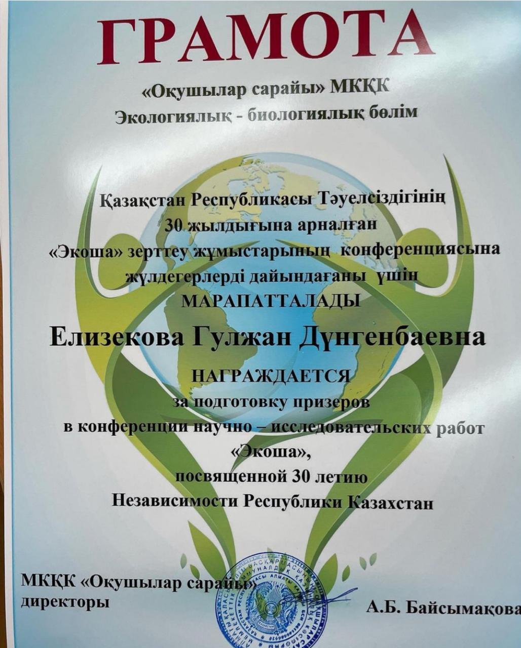 18 декабрь 2021 0 1 2 3 4 5 "Экоша" зерттеу жұмыстарына жүлдегерлерді дайындағаны үшін Алишарова Несібелі және Елизекова Гүлжан ұстаздарымыз марпатталады.