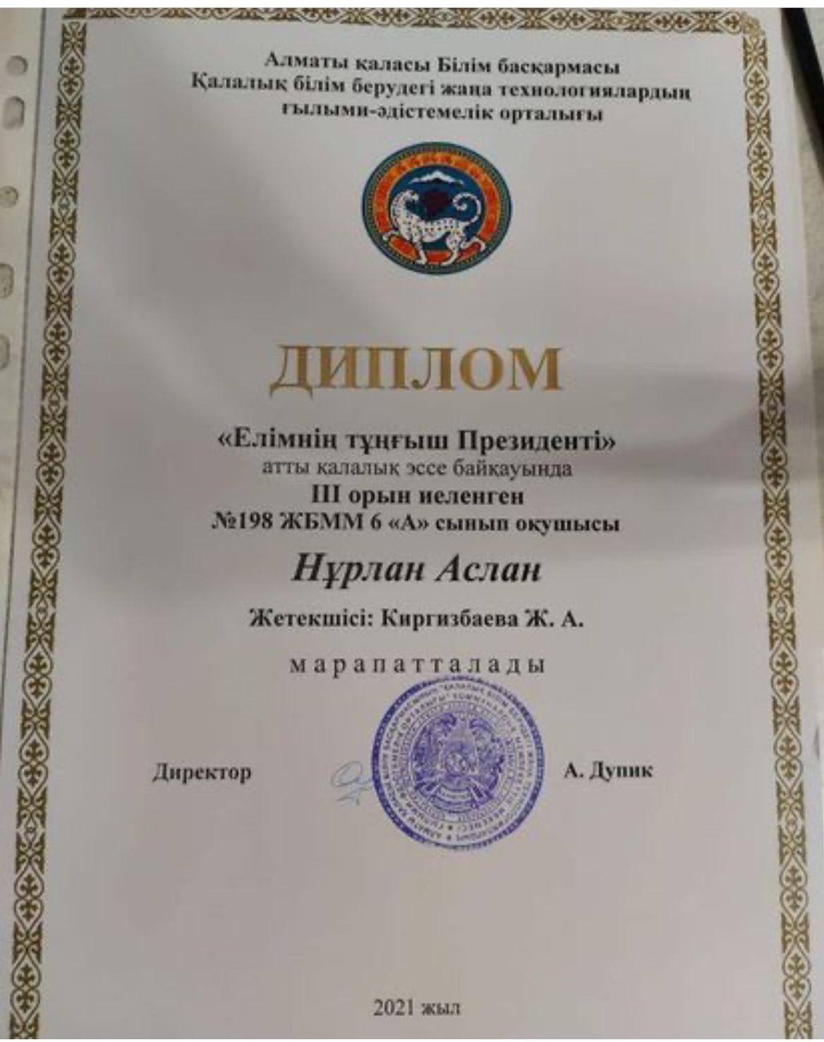 08 январь 2022 0 1 2 3 4 5 "Елімнің тұңғыш Президенті" атты қалалық эссе байқауында 3 орын иеленген 6 сынып оқушысы Нұрлан Асан.