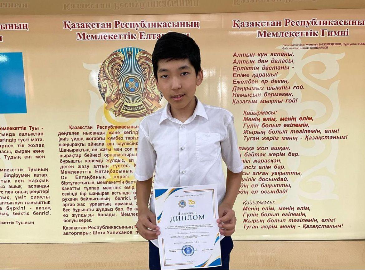 20 январь 2022 0 1 2 3 4 5 7 сынып оқушысы Жанұзақ Райымбек қалалық "Зерде" ғылыми жобасынан Химия пәнінен 3 орын иеленді.