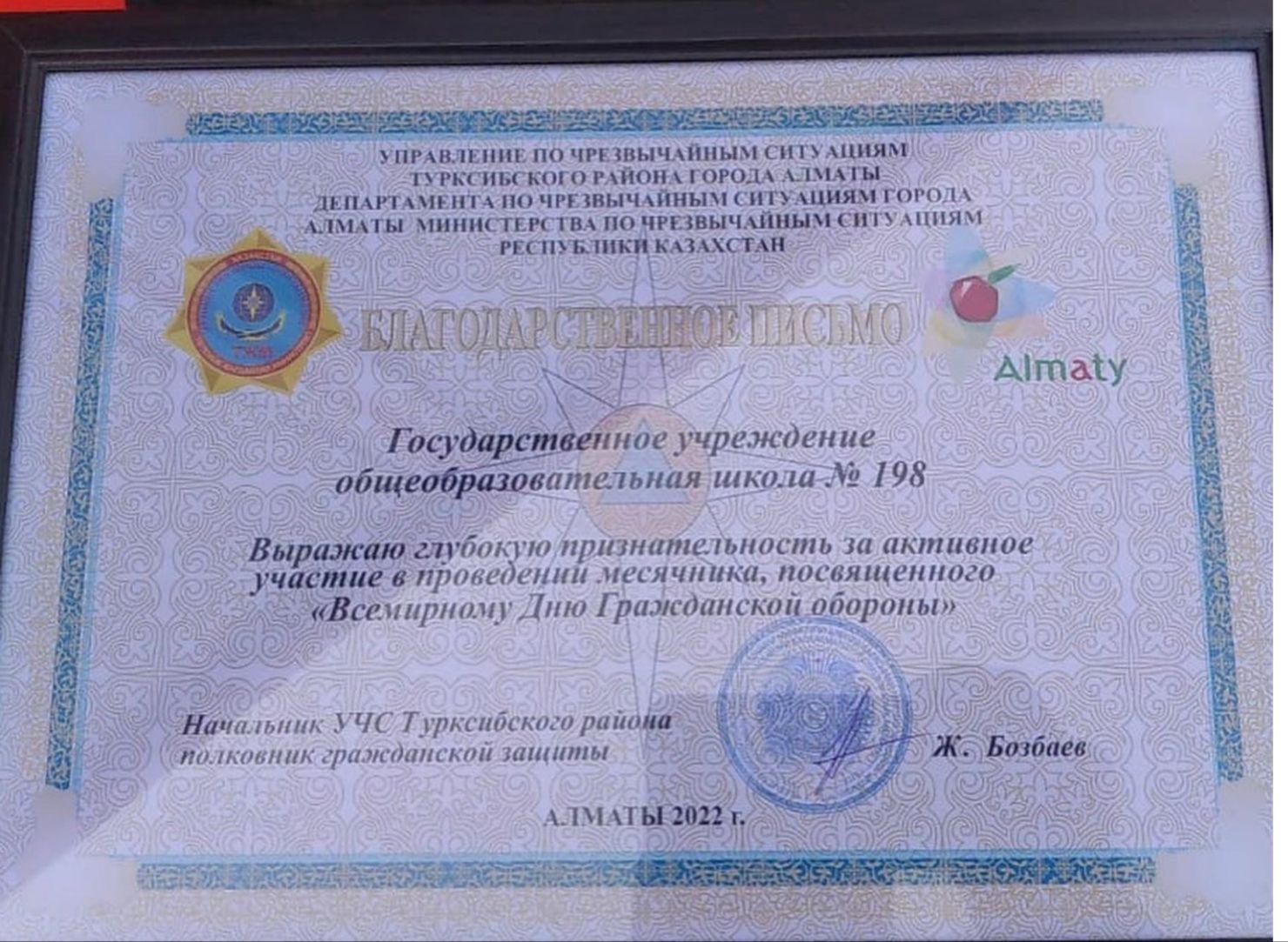 05 апрель 2022 0 1 2 3 4 5 Қорғаныс күніне орай Түрксіб ауданының Дунентаев 6 әскери өрт сөндіру қызметінде 198 мектептің атына алғыс хат.
