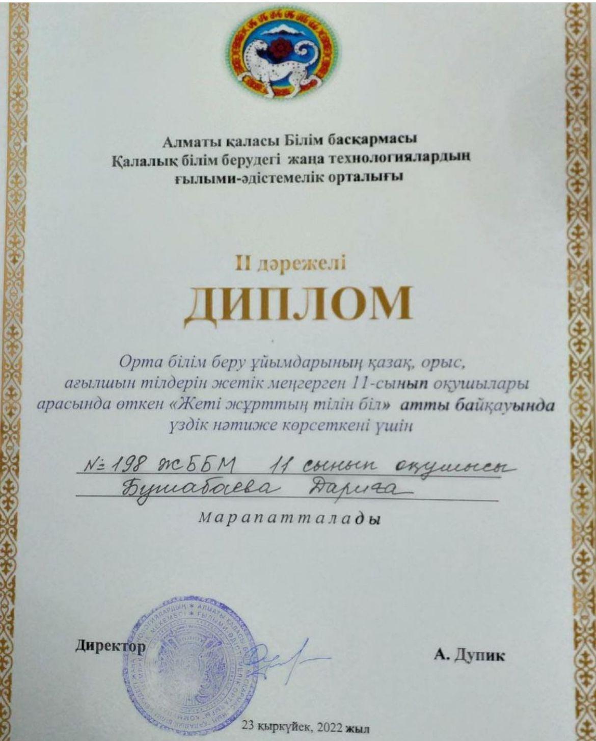 06 октябрь 2022 0 1 2 3 4 5 "Жеті жұрттың тілін біл!" атты қалалық олимпиададан 11 сынып оқушысы Бушабаева Дариға 2 орын иеленді. Құттықтаймыз!!