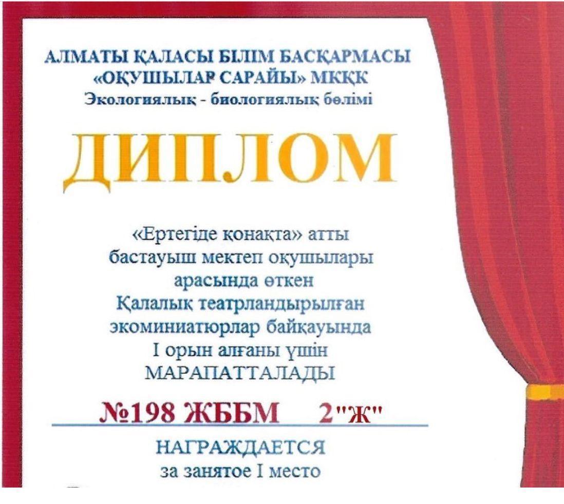 Алматы қаласы Білім басқармасының" №198 жалпы білім беретін мектебі " КММ » Ақпарат » “Ертегідегі қонақта” атты бастауыш мектеп оқушылары арасында өткен қалалық театрландырылған байқауында мектебіміздің 2 “Ж” сынып оқушылары 1 орын иеленіп, республикалық кезеңге жолдама алды. Құттықтаймыз!!! Жетекшісі: Кудабаева Жанаргүль.