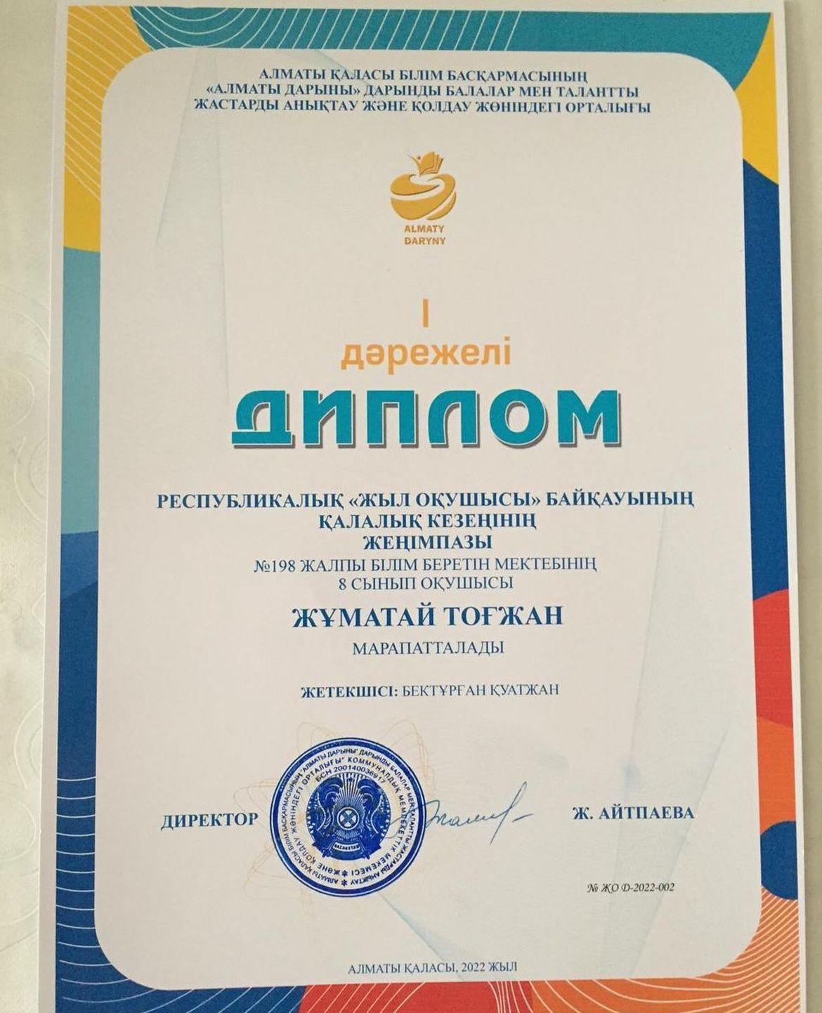 10 декабрь 2022 0 1 2 3 4 5 Республикалық “Жыл оқушысы” байқауының қалалық кезеңінде мектебіміздің 8 “Б” сынып оқушысы Жұматай Тоғжан 1 орын иеленіп, республикалық кезеңге жолдама алды. Құттықтаймыз!!!