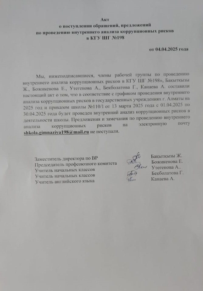 04 апрель 2025 0 1 2 3 4 5 АКТ о поступлении обращений, предложений по проведению внутреннего анализа коррупционных рисков в КГУ ШГ №198