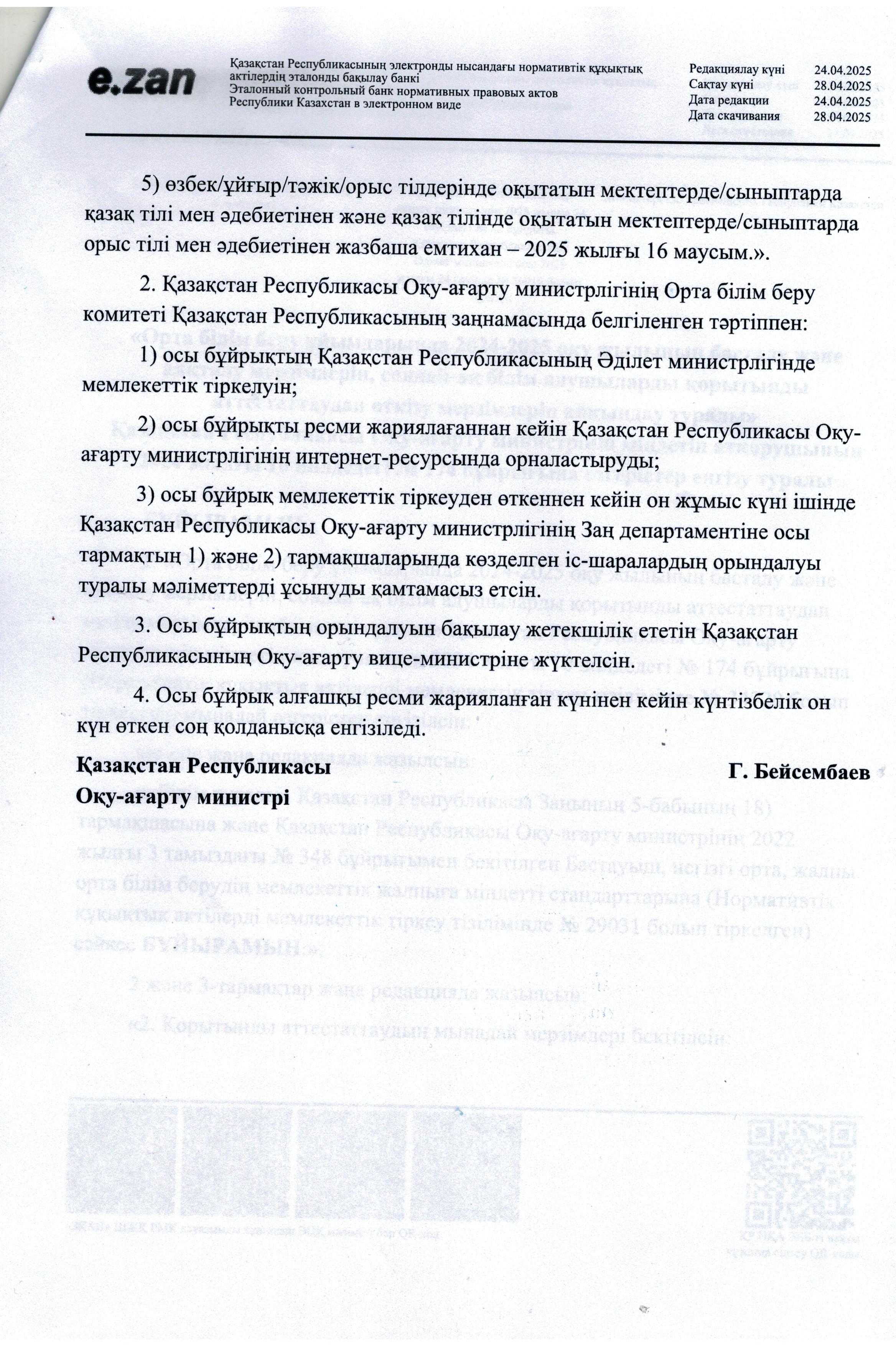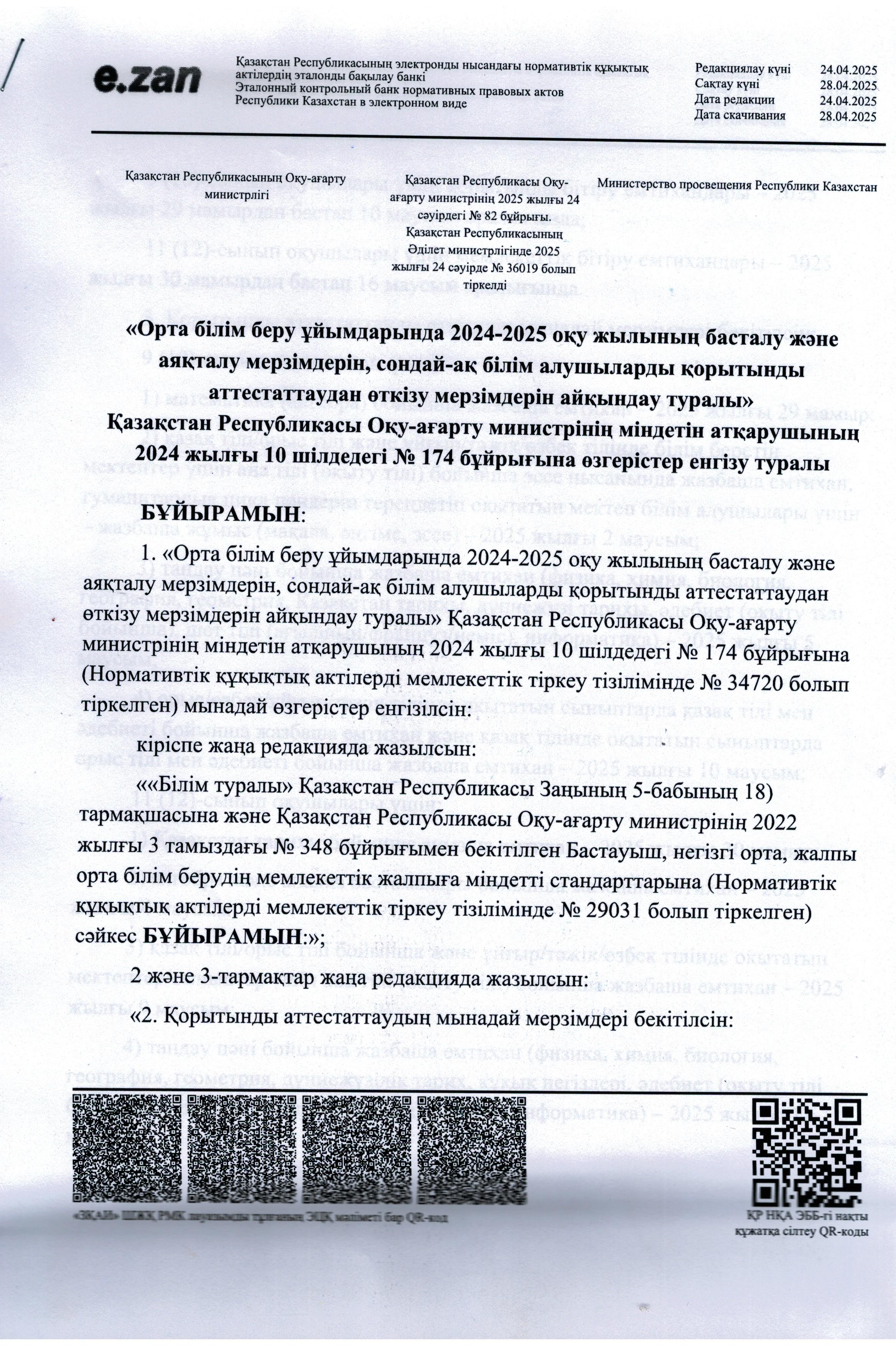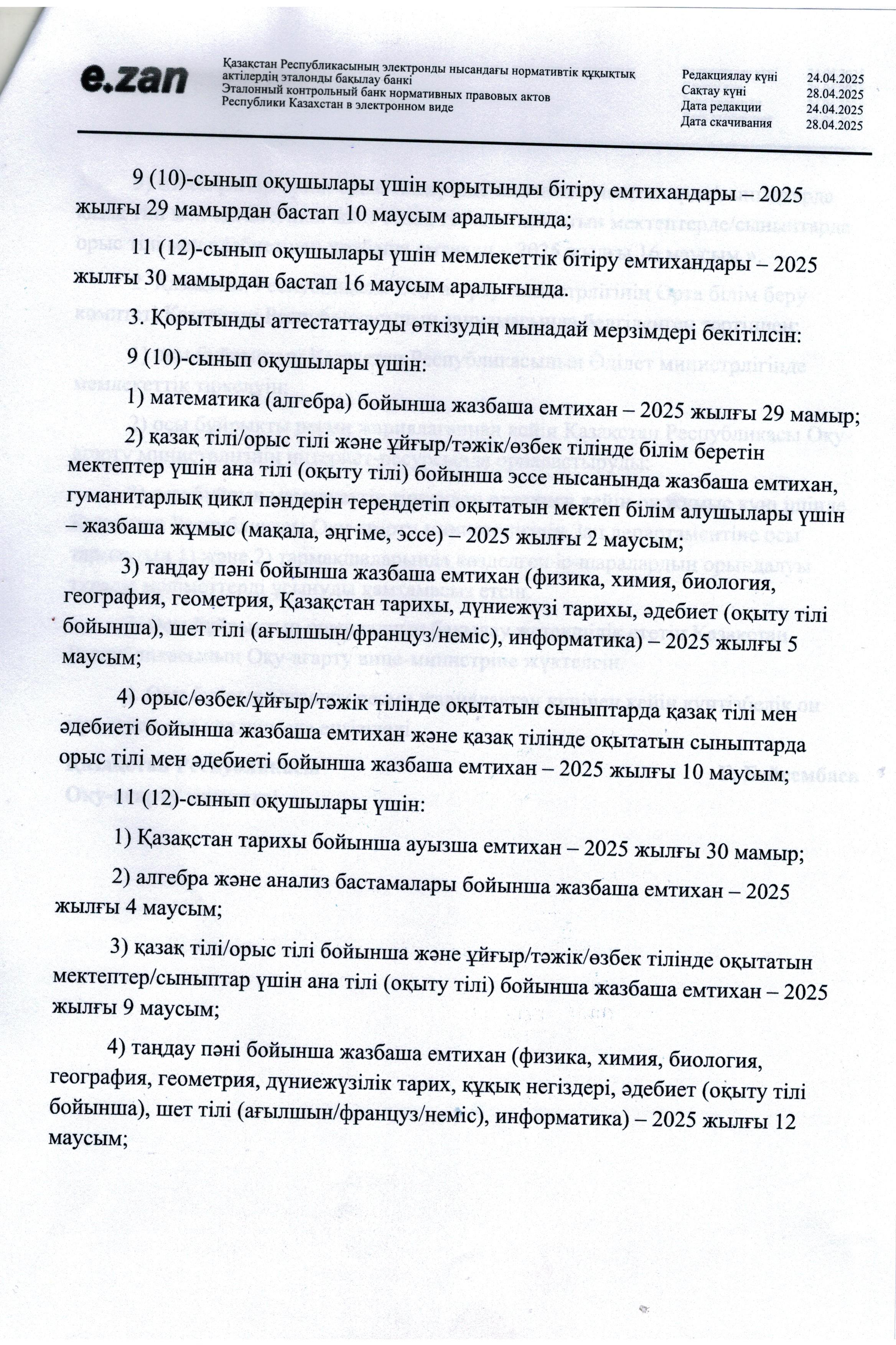 28 апрель 2025 0 1 2 3 4 5 Орта білім беру ұйымдарында 2024-2025 оқу жылының басталу және аяқталу мерзімдерін, сондай-ақ білім алушыларды қорытынды аттестаттаудан өткізу мерзімдерін айқындау туралы"