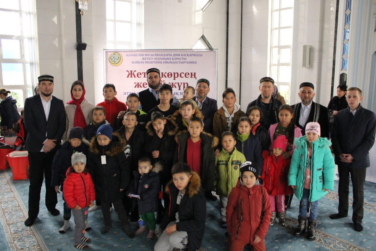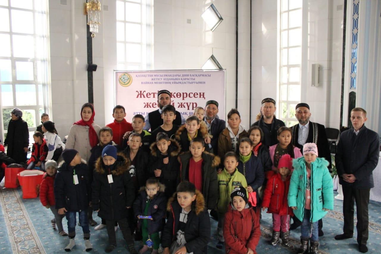 11 ноябрь 2019 0 1 2 3 4 5 "Жетім көрсең жебей жүр" №198 жалпы білім беретін мектептің 1-11 сынып аралығындағы жетім, аз қамтылған балаларға мешіт тарапынан қысқы сырт киім, спорттық киімдермен және жылы киім-кешектер тәтті тағамдармен қамтамасыз етті
