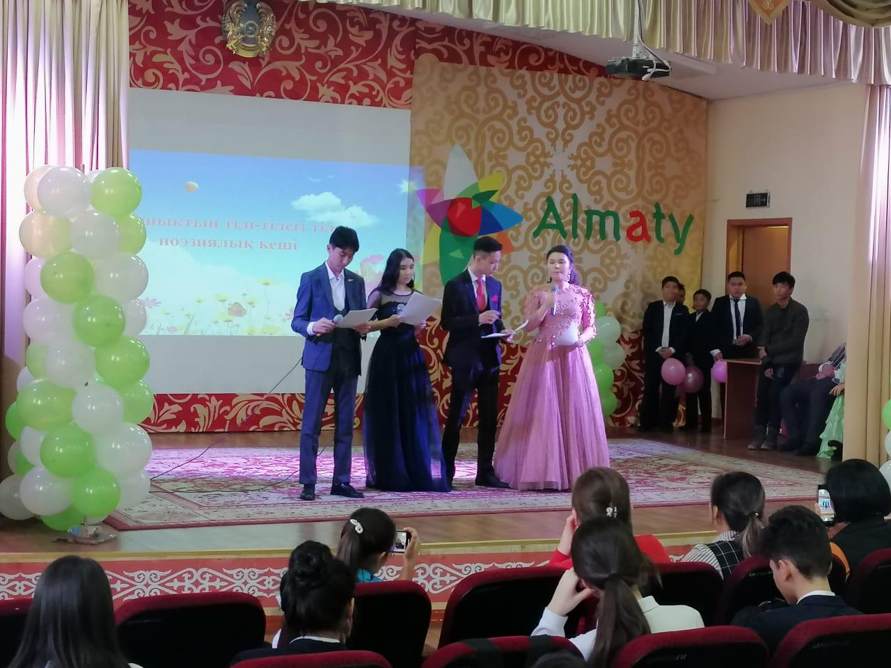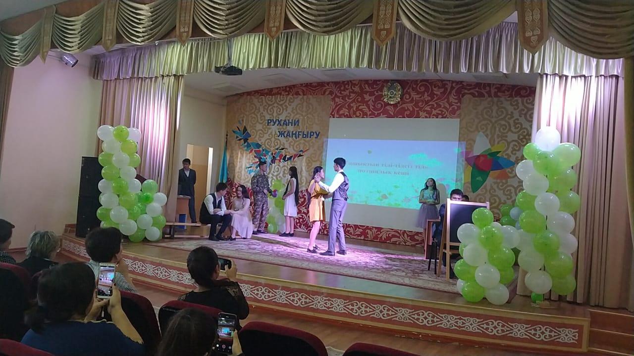 "Ұлттық құндылық пен тілге құрмет, сапалы білім - сналы ұрпаққа таусылмас азықә атты қоғамдық-гуманитарлық пәндер бірлестігінің онкүндігі аясында қазақ тілі мен әдебиеті пәнінің мұғалімі Кеңесова Береке мен Қамбарбекова Жаңыл апайлар "Ғашықтың тілі- тілсіз тіл" атты тақырыпта махаббат, көктем тақырыбын арқау ете отырып, театрландырылған сахналық қойылыммен керемет кеш өткізді.