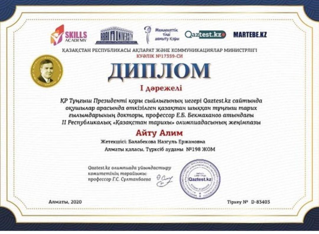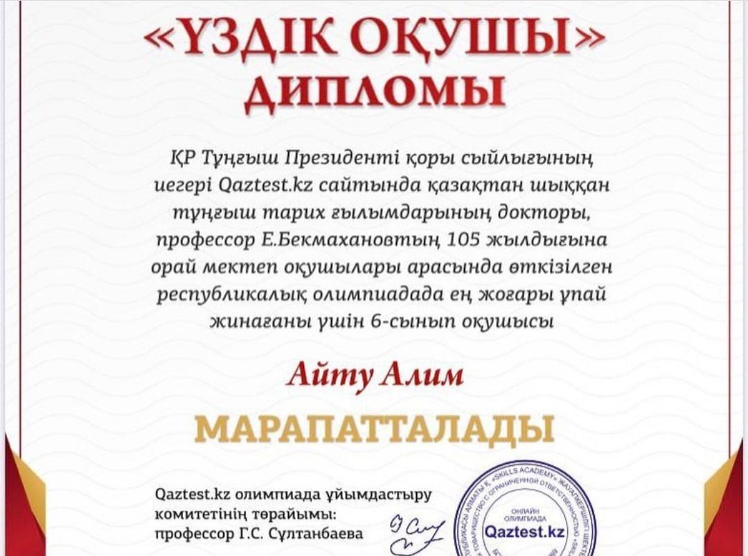 Тұңғыш Президенті қоры сйлығының иегері Qaztest.kz сайтында оқушылар арасында өткізілген қазақтан шыққан тұңғыш тарих ғылымдарының докторы, профессор Е.Б.Бекмаханов атындағы II Республикалық "Қазақстан тарихы" олимпиадасының жеңімпазы - 6 "В" сынып оқушысы Айту Алим I дәрежелі дипломмен марапатталды.