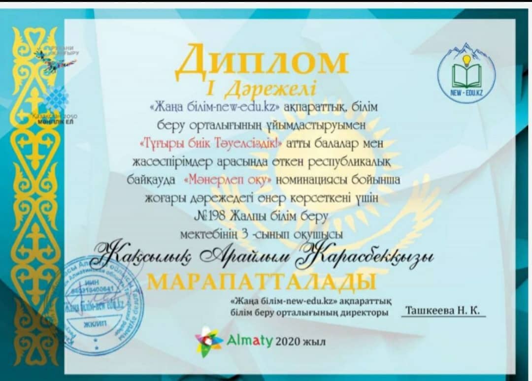 16 январь 2021 0 1 2 3 4 5 Тұғыры биік Тәуелсіздік Тұғыры биік Тәуелсіздік атты балалар мен жасөспірімдер арасында мәнерлеп оқу, эссе номинациясына қатысып оқушыларымыз жүлделі І орындарды иеленді. Жетекшісі: Айгүл апай. Құттықтаймыз