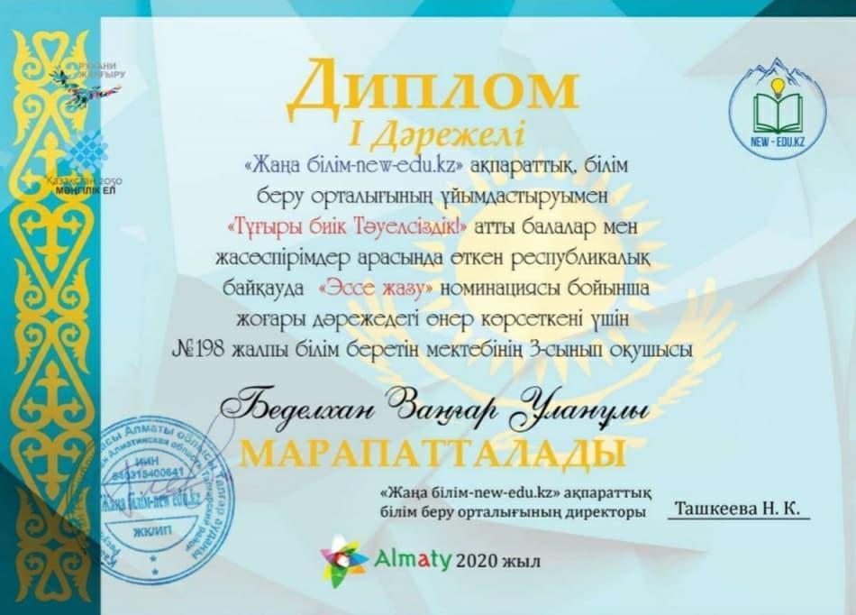 18 январь 2021 0 1 2 3 4 5 Тұғыры биік Тәуелсіздік Тұғыры биік Тәуелсіздік атты балалар мен жасөспірімдер арасында мәнерлеп оқу, эссе номинациясына қатысып оқушыларымыз жүлделі І орындарды иеленді. Жетекшісі: Айгүл апай. Құттықтаймыз