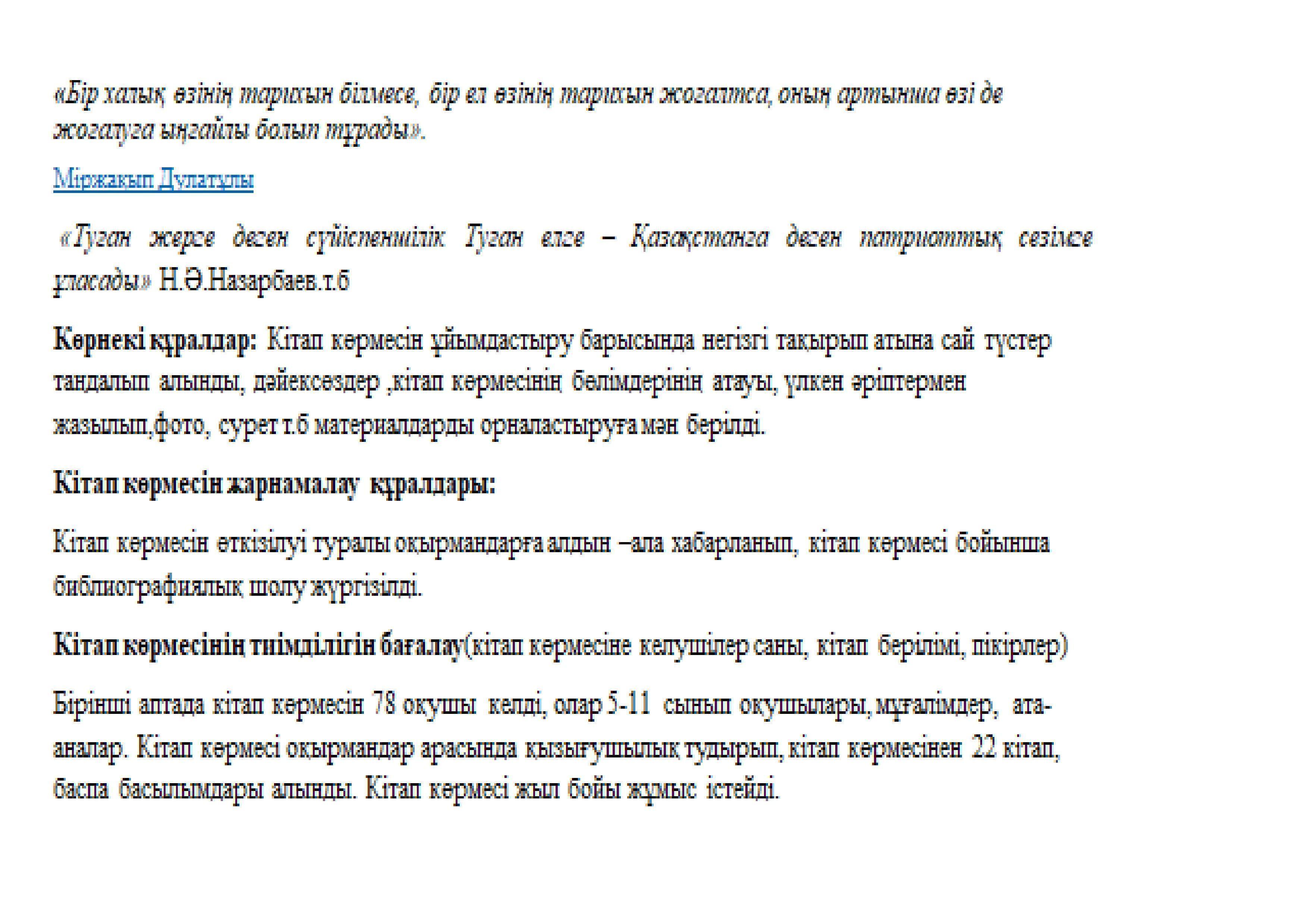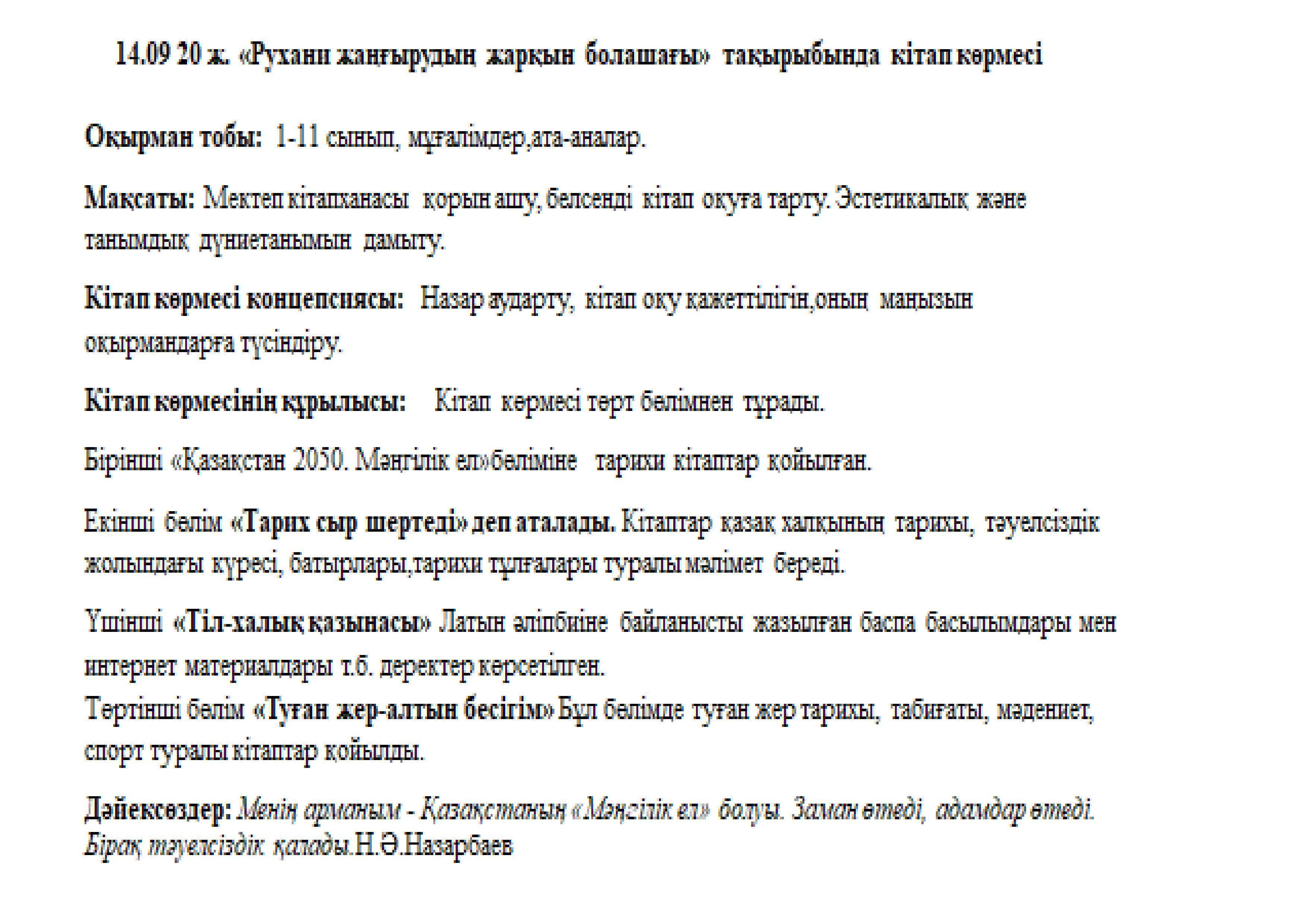 15 март 2021 0 1 2 3 4 5 «Рухани жаңғырудың жарқын болашағы» Мектеп кітапханасы қорын ашу, белсенді кітап оқуға тарту. Эстетикалық және танымдық дүниетанымын дамыту.