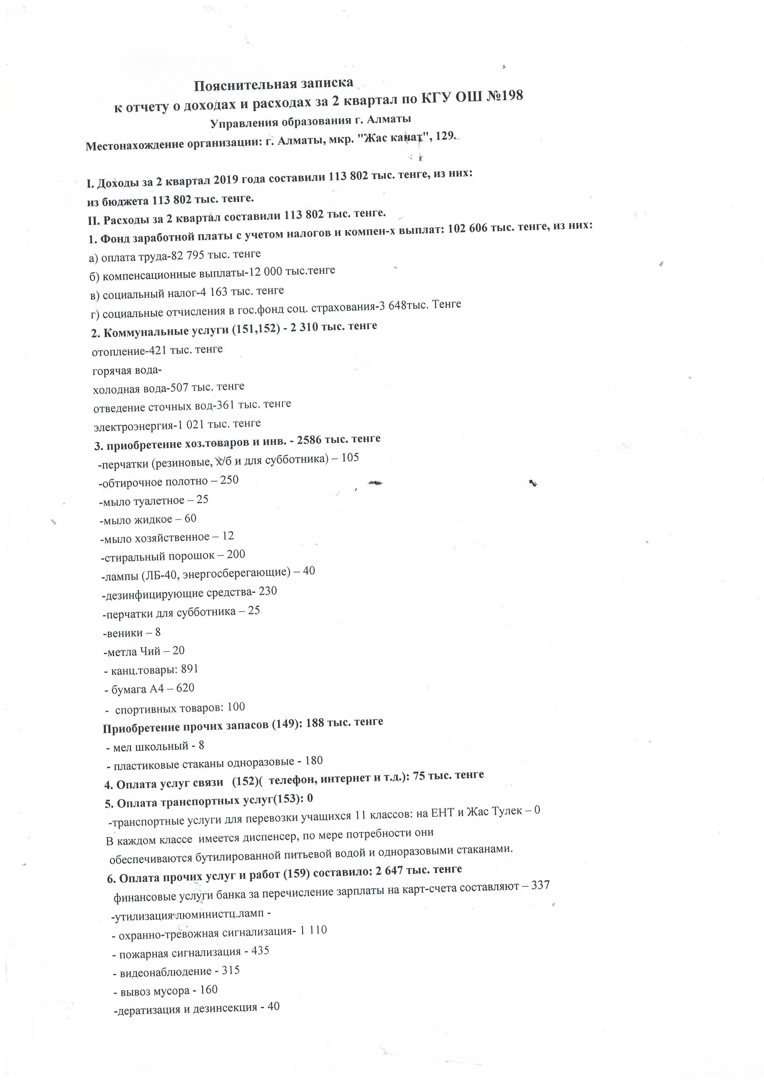 Кіріс және шығыс есебі 2 квартал 2019 жыл