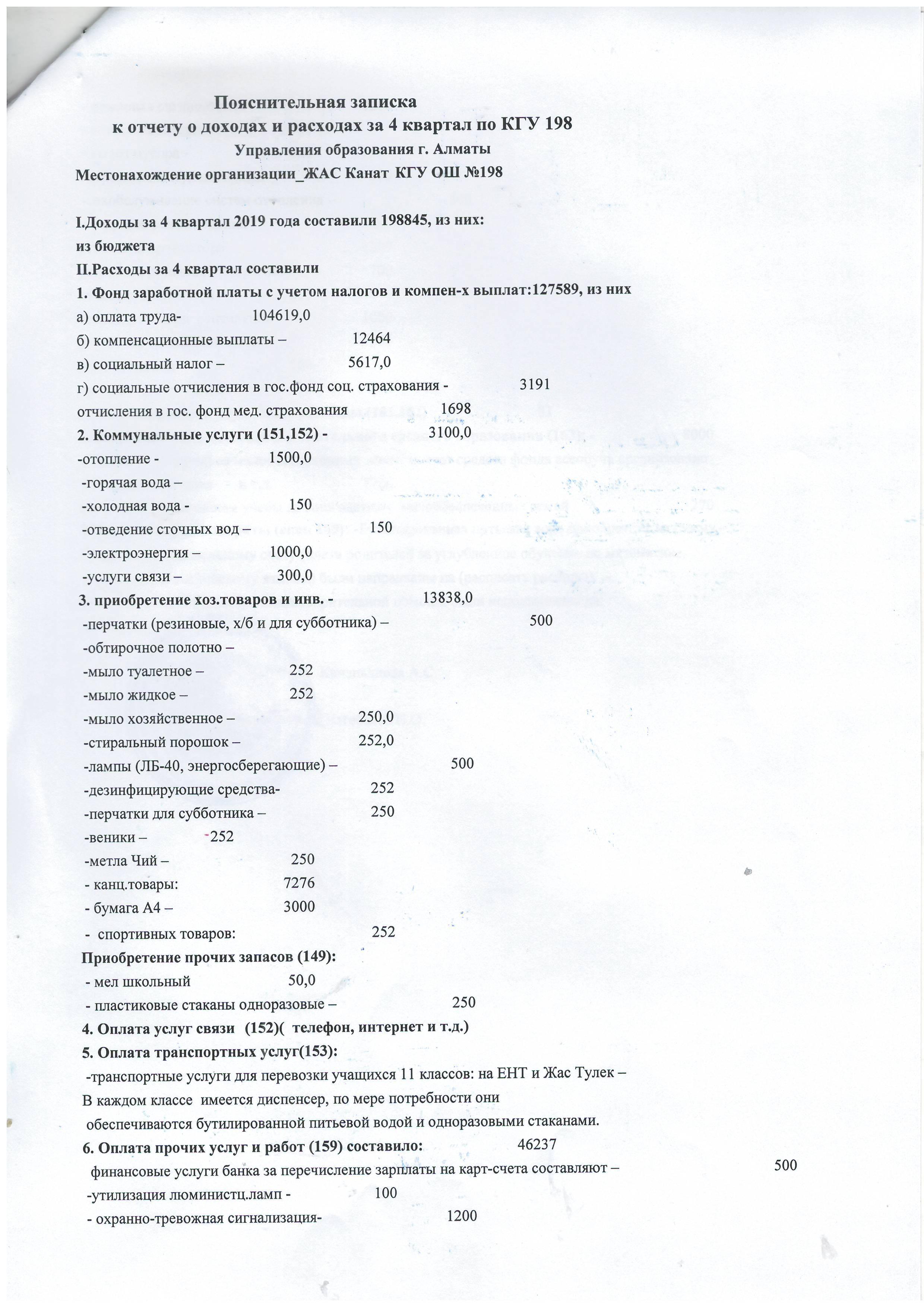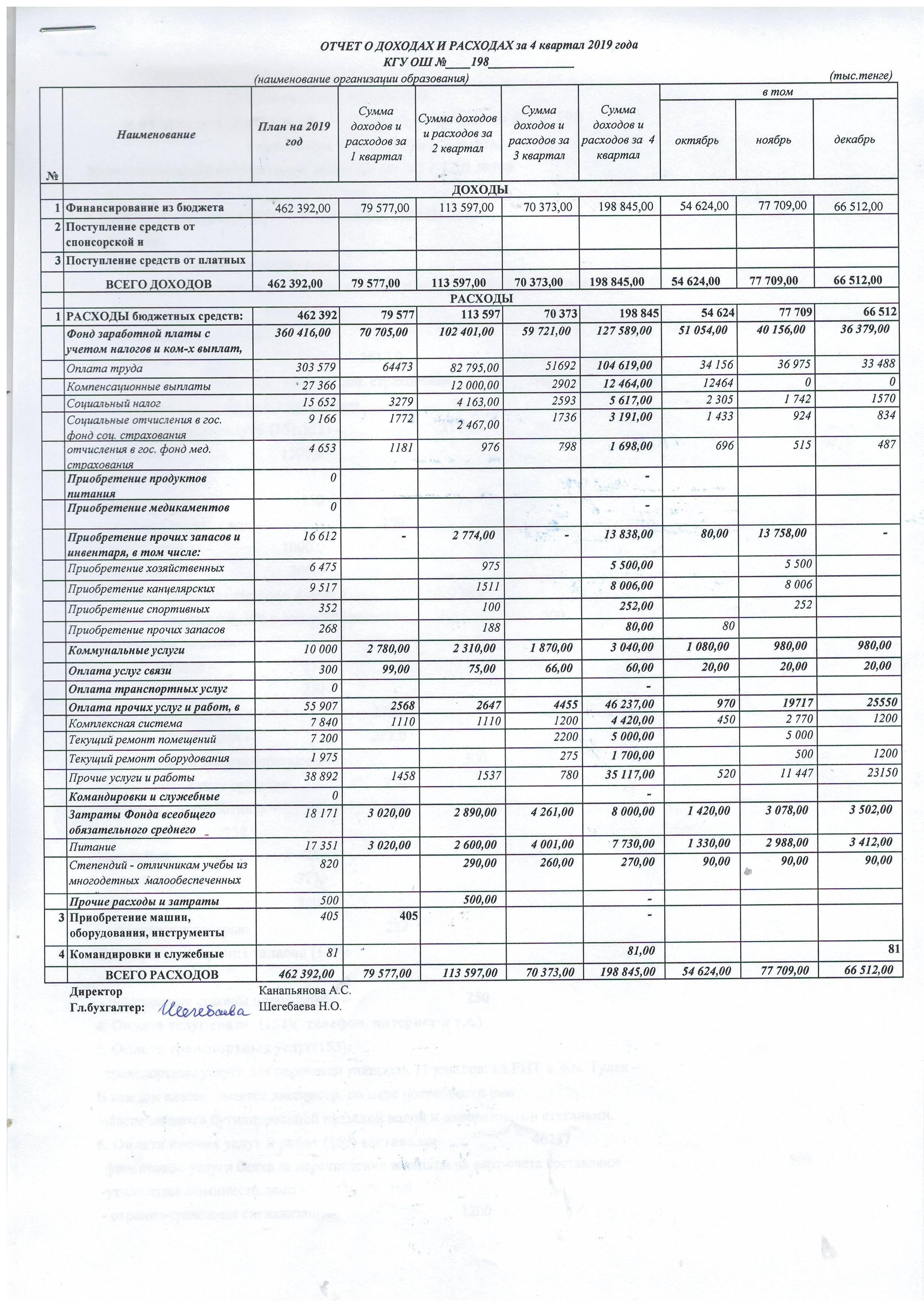 Кіріс және шығыс есебі 4 квартал 2019 жыл