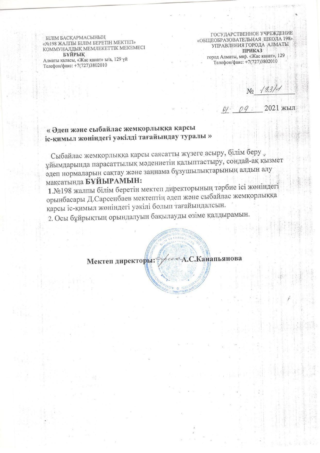 01 сентябрь 2021 0 1 2 3 4 5 Әдеп және сыбайлас жемқорлыққа қарсы іс-қимыл жөніндегі уәкілді тағайындау туралы