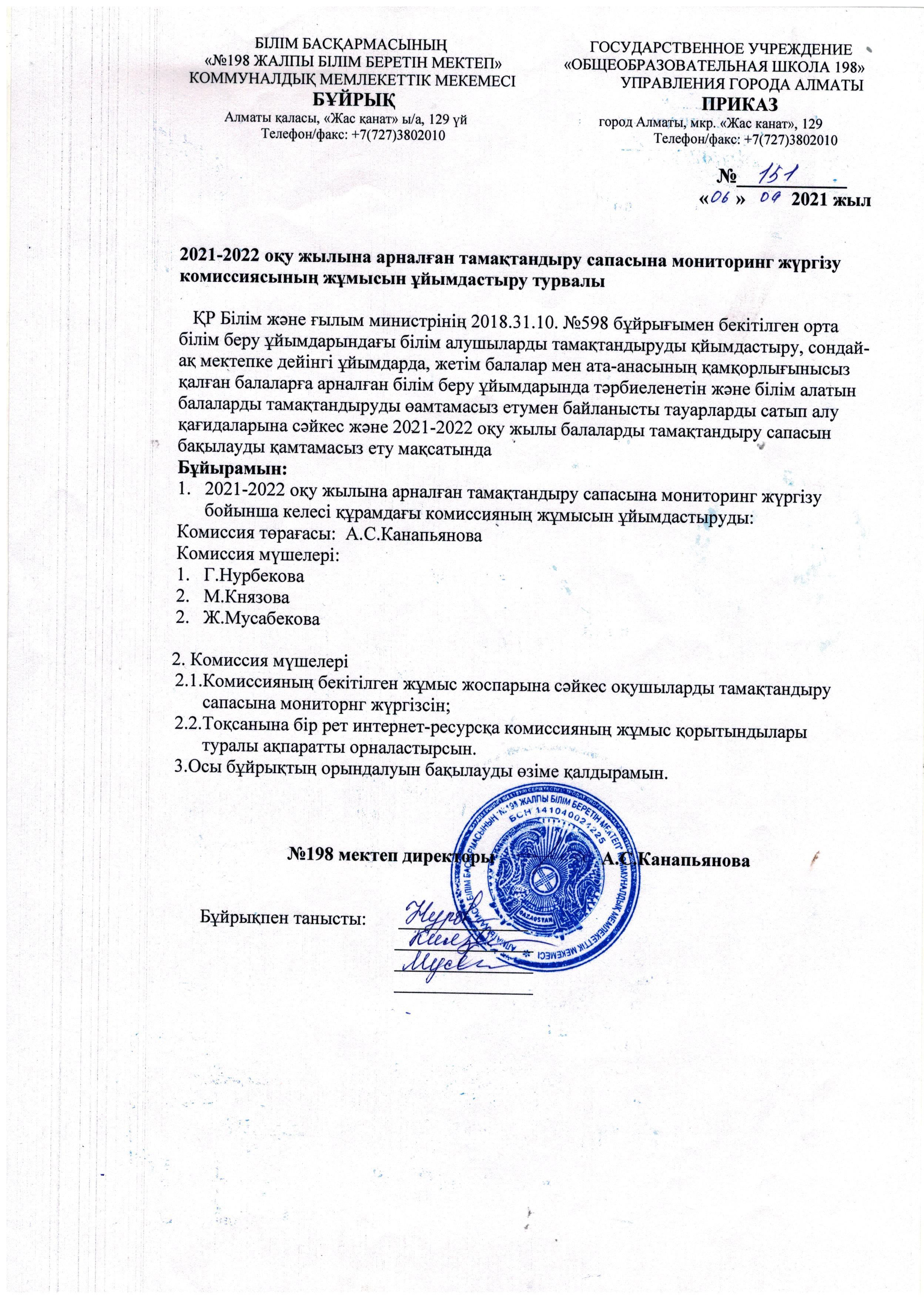 06 сентябрь 2021 0 1 2 3 4 5 2021-2022 оқу жылына арналған тамақтандыру сапасына мониторинг жүргізу комиссиясының жұмысын ұйымдастыру туралы