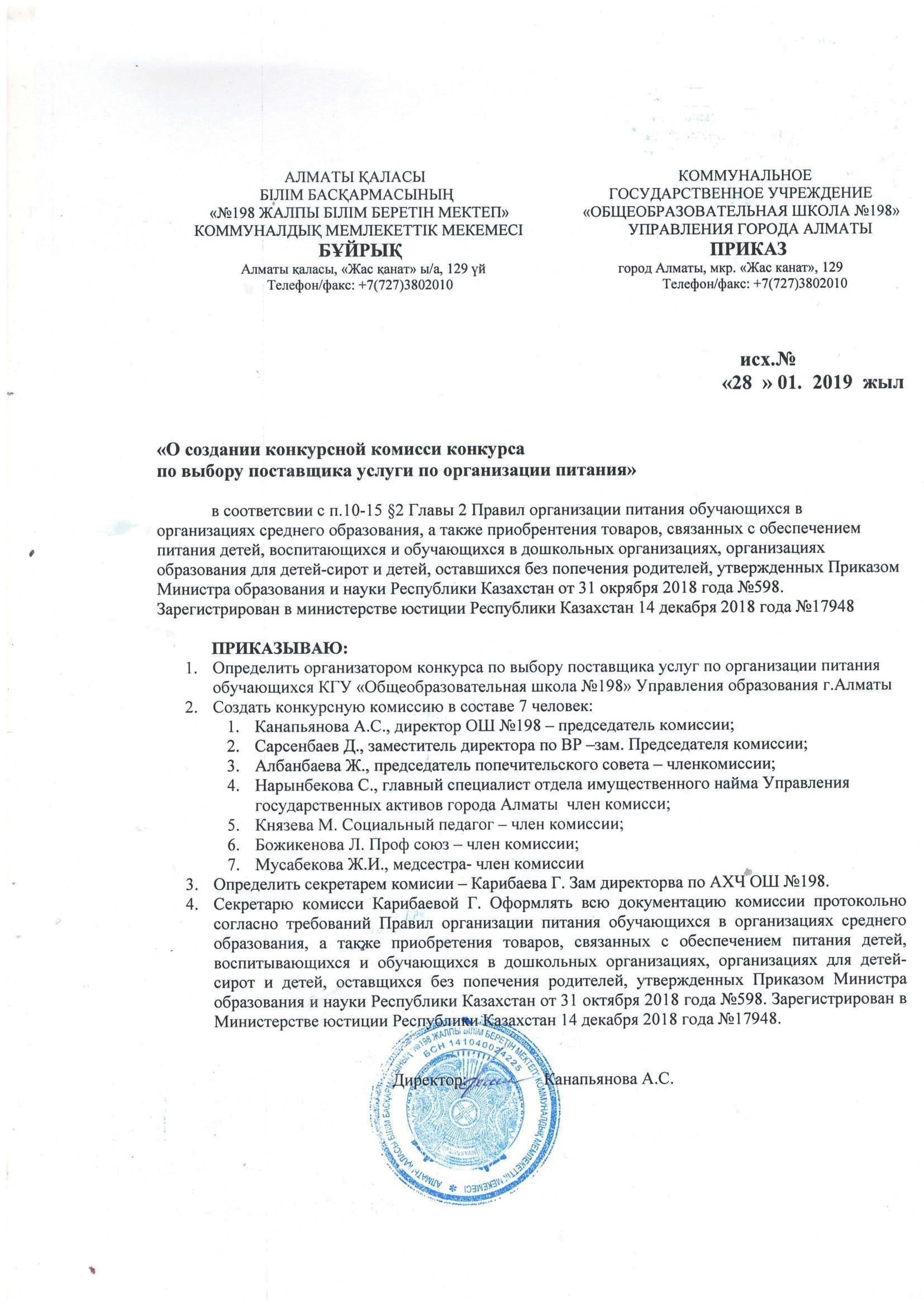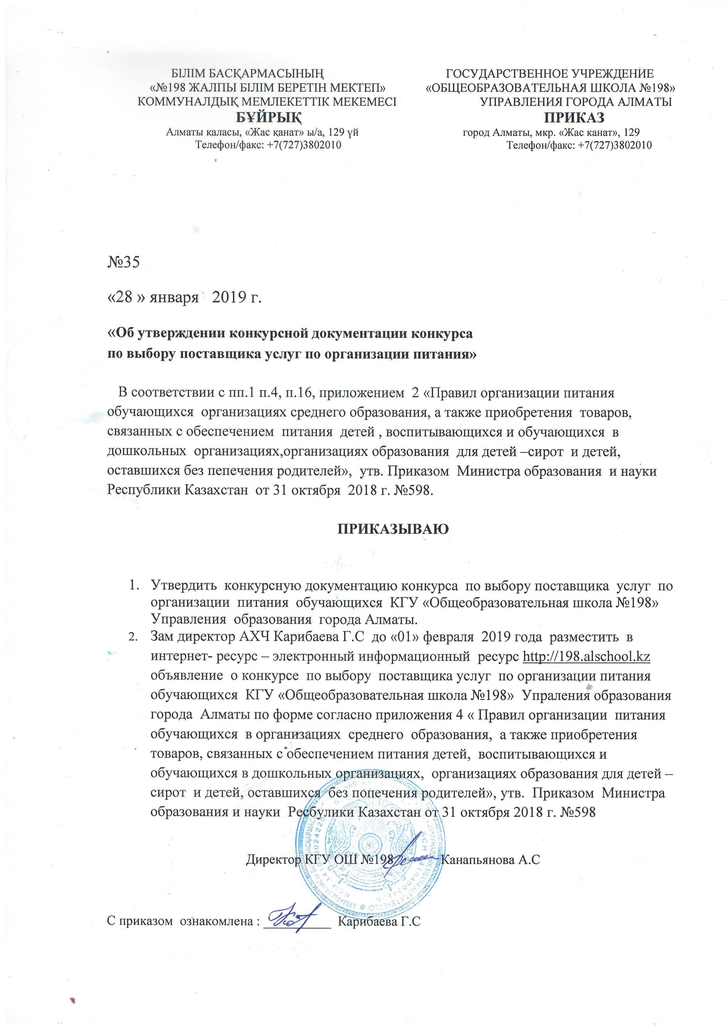 31 январь 2019 0 1 2 3 4 5 Қоғамдық тамақтандыру қызметтерін берушіні таңдау бойынша конкурстық құжаттаманы бекіту туралы бұйрық