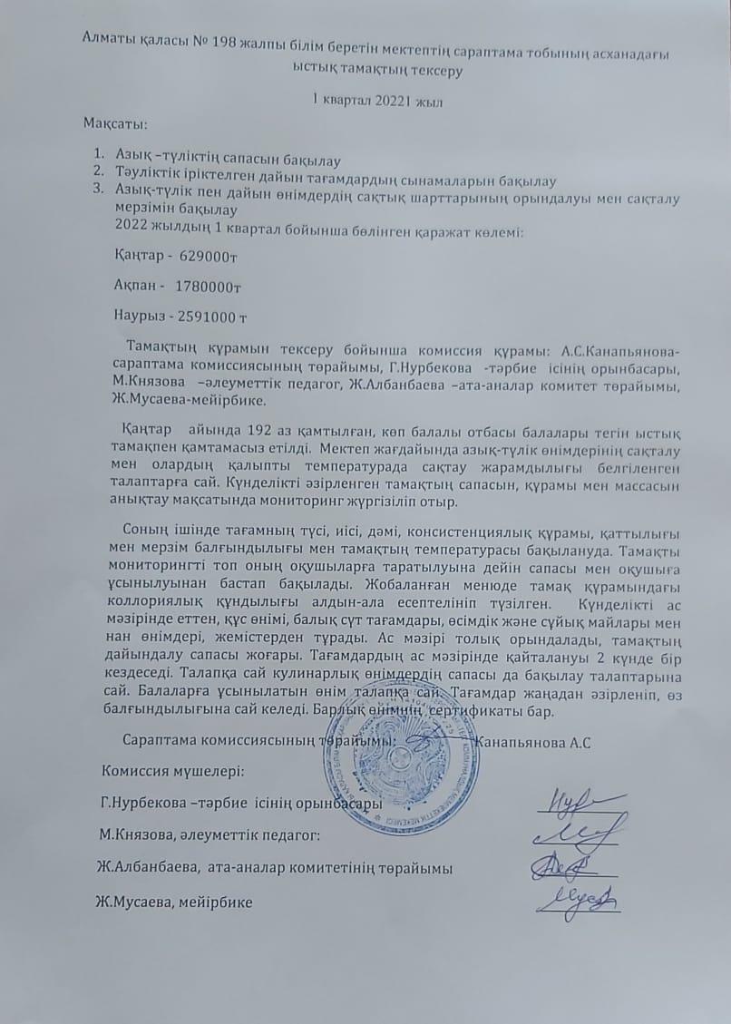 » Асханадағы ыстық тамақтың текеру сапасының анықтамасы 1 квартал 2022