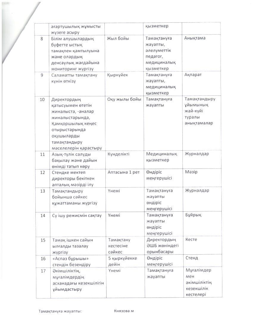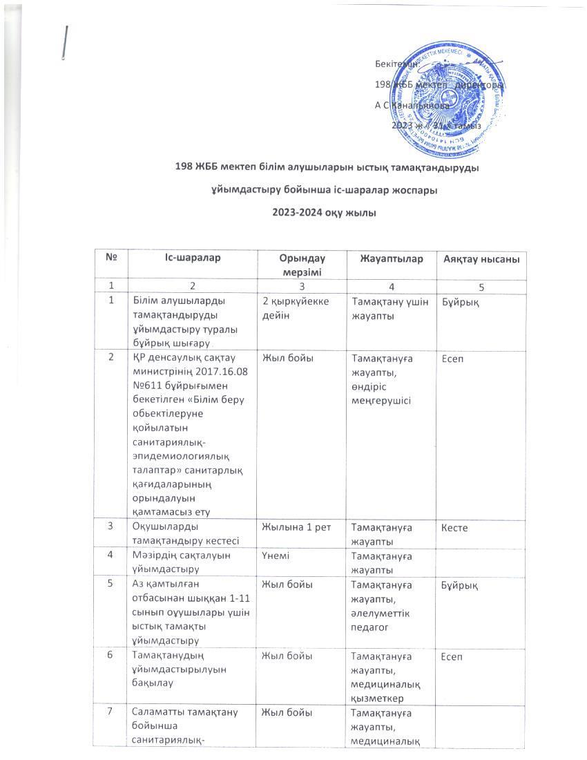 01 сентябрь 2023 0 1 2 3 4 5 №198 ЖББ мектеп білім алушыларын ыстық тамақтандыруды ұйымдастыру бойынша іс-шаралар жоспары 2023-2024 оқу жылы