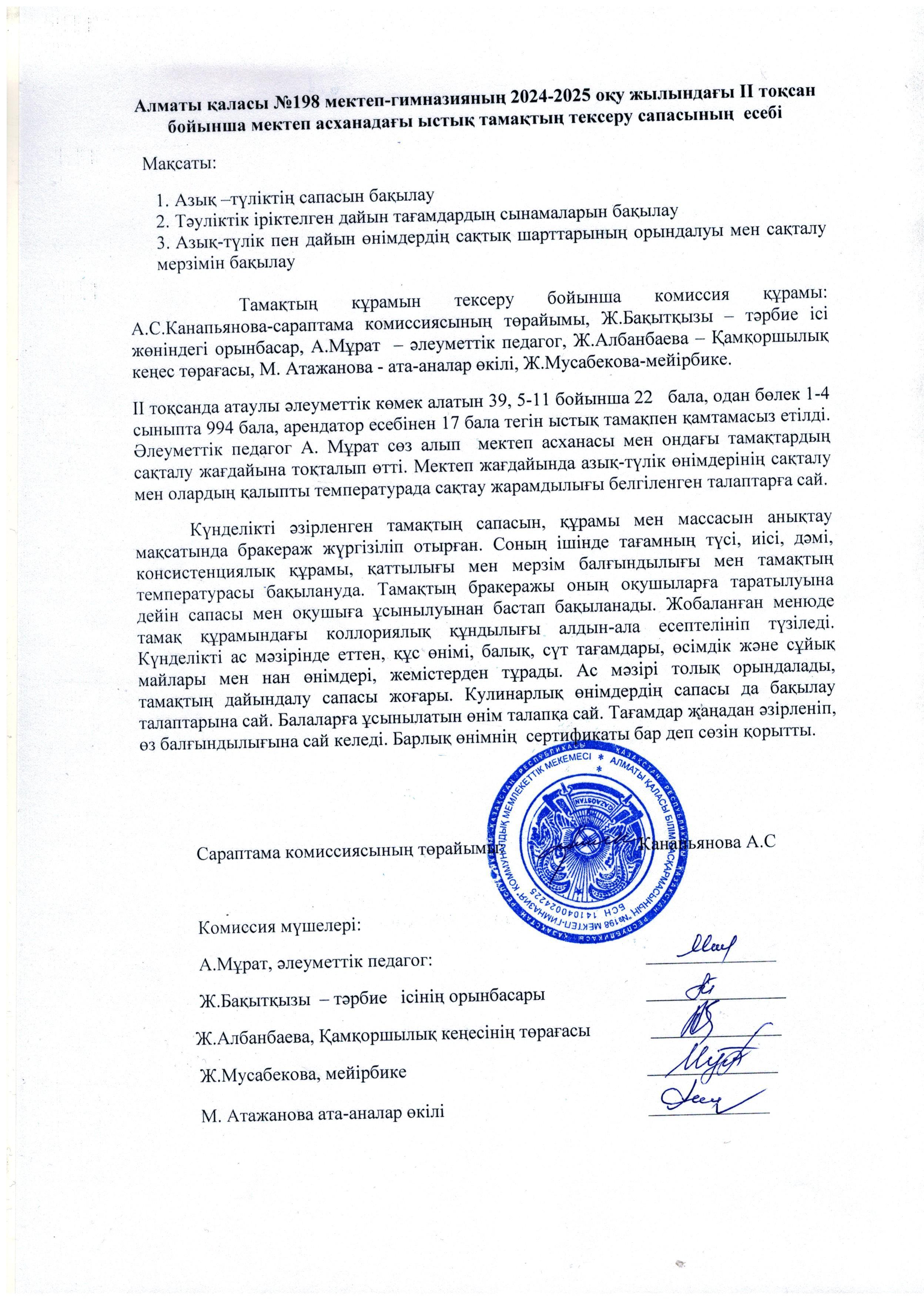 27 декабрь 2024 0 1 2 3 4 5 Алматы қаласы №198 мектеп-гимназияның 2024-2025 оқу жылындағы II тоқсан бойынша мектеп асханадағы ыстық тамақтың тексеру сапасының есебі