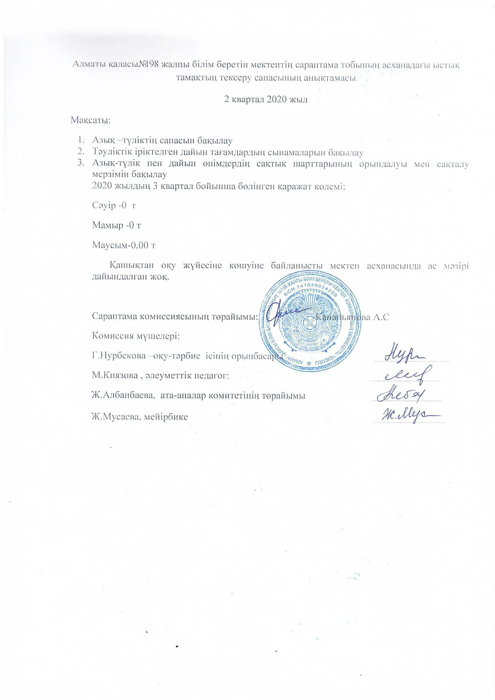 » Ыстық тамақтың тексеру сапасының анықтамасы 2 квартал 2020 жыл
