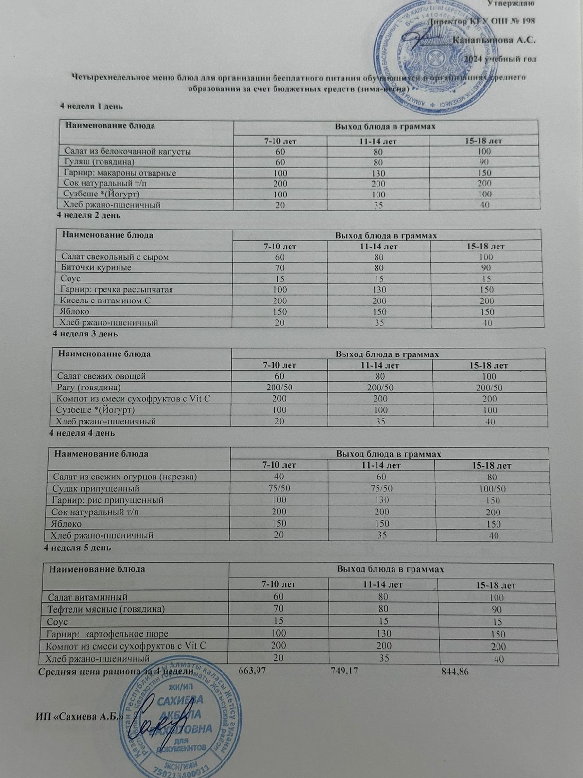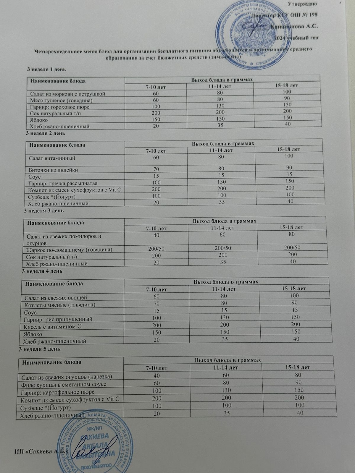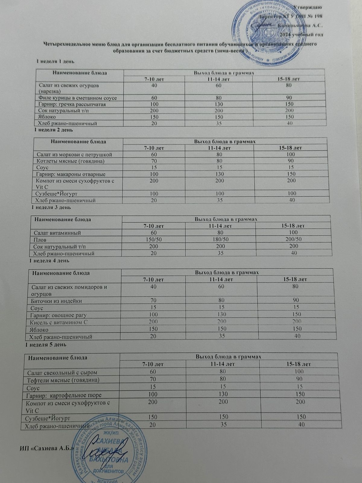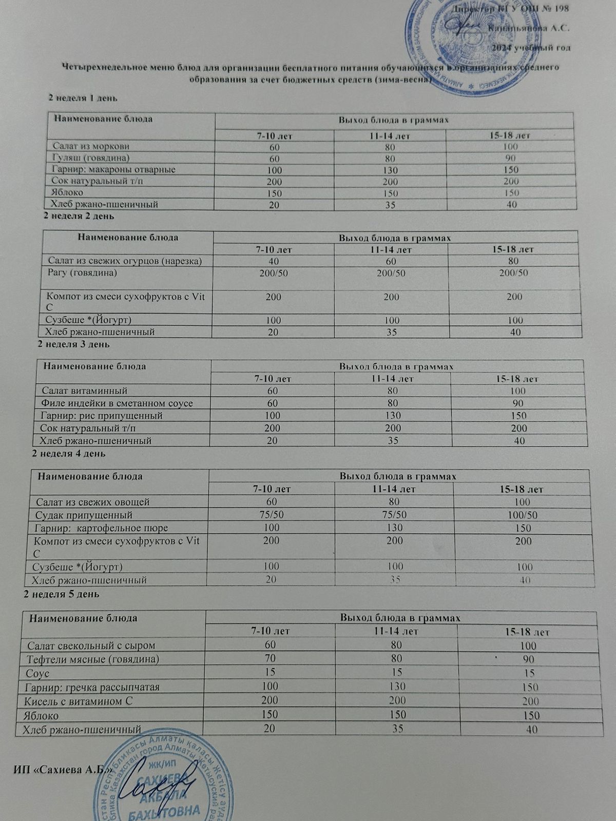 4 апталық тегін тамақтанудың ас мәзірі қыс-көктем 2024 жыл
