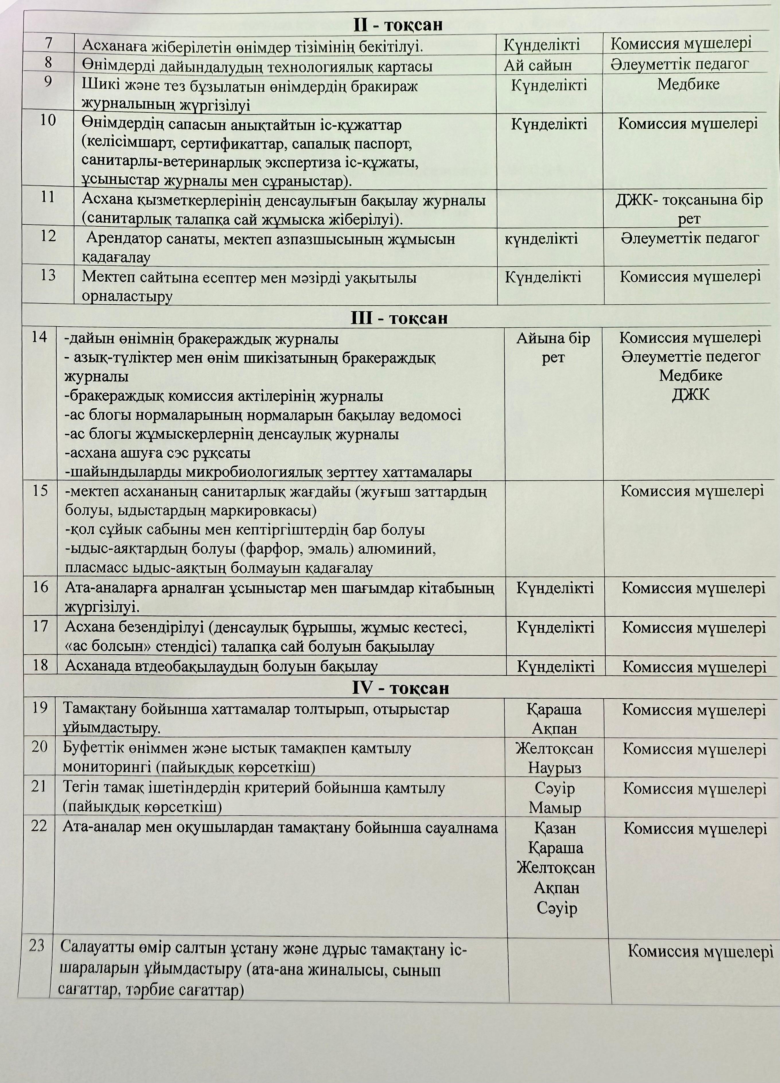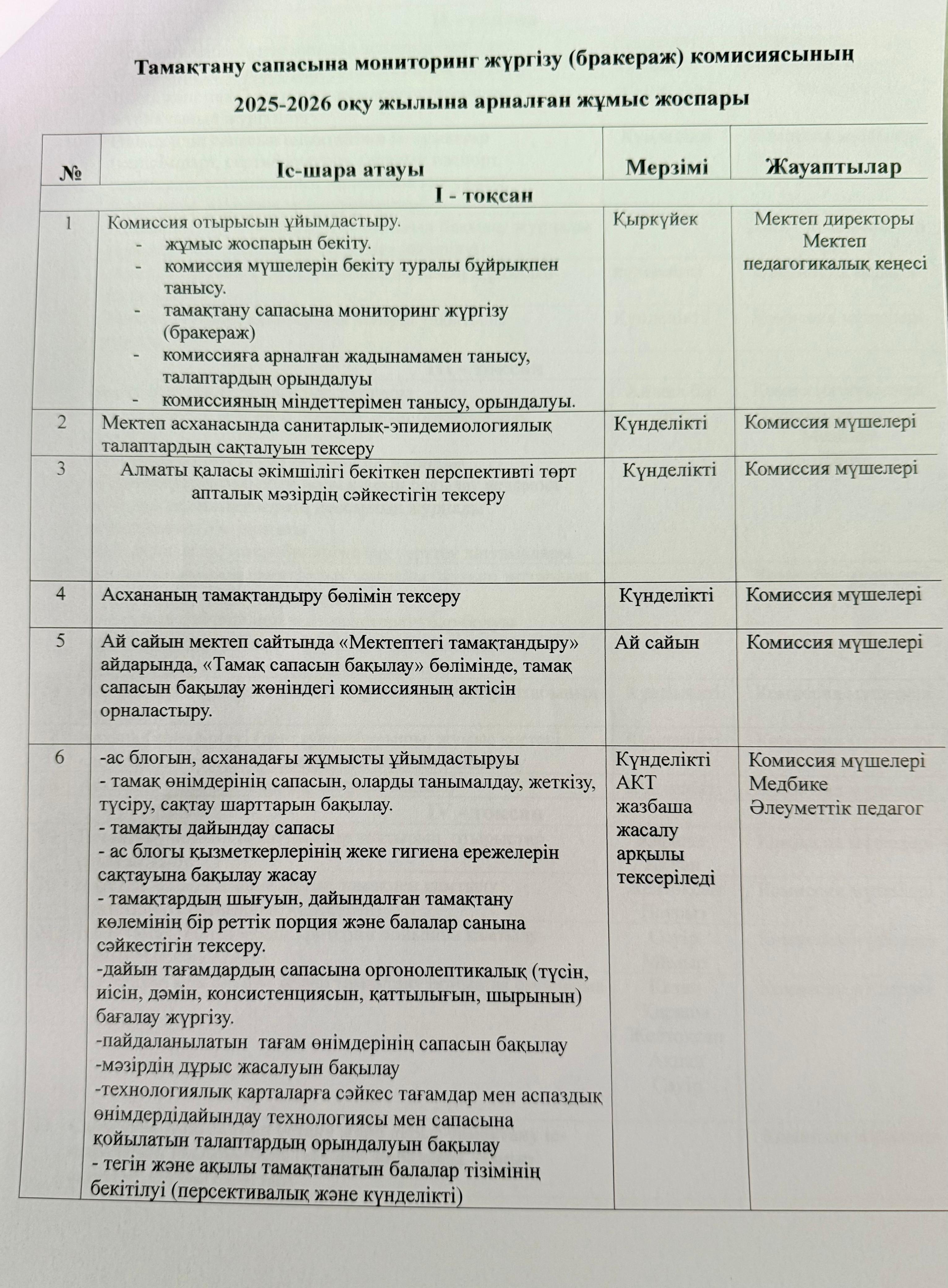 02 сентябрь 2025 0 1 2 3 4 5 Тамақтану сапасына мониторинг жүргізу (бракераж) комисиясының 2025-2026 оқу жылына арналған жұмыс жоспары